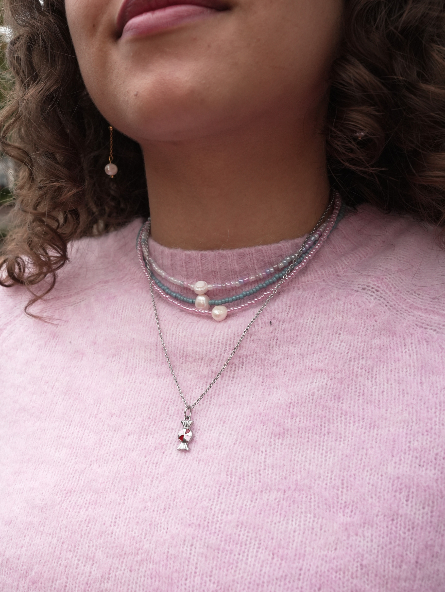 L’ensemble crée une ligne fine et harmonieuse autour du cou. La perle au centre apporte un point de lumière délicat, discret mais remarquable.